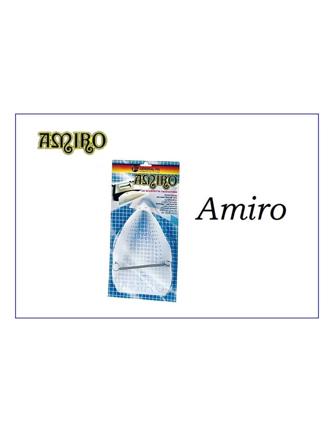 Amiro, la scarpetta salvastiro antiaderente, è la risposta più semplice ed efficace ad uno dei problemi più diffusi nell’impiego del ferro da stiro, strinare i capi delicati. Applicato alla piastra del ferro, elimina il rischio di bruciature, grazie al materiale utilizzato, in teflon. La facilità d’impiego, la sua adattabilità a qualsiasi tipo di piastra e la possibilità di stirare senza faticaì, fanno di amiro un oggetto destinato ad entrare in tutte le case. Amiro è confezionato in blister dove sul cartoncino sono illustrate le caratteristiche principali. Stesse caratteristiche e funzionalità di soletta salvastiro, con spessore 0,4 mm.